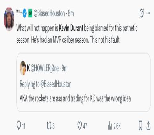 一位火箭球迷认为球队煞费苦心的交易得到杜兰特,最终战绩还不如上赛季的太阳,太搞笑。